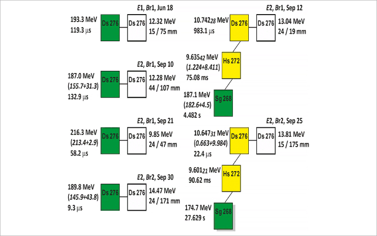 В эксперименте 2022 года использовалась реакция, которая еще не изучалась нигде в мире – взаимодействие пучка кальция-48 с мишенным материалом тория-232. В этой комбинации были получены сразу три неизвестных ранее изотопа: дармштадтий-276 (шесть событий), хассий-272 и сиборгий-268 (по два события). Оказалось, что дармштадий-276 за доли миллисекунды испытывает альфа-распад в хассий-272, а хассий, в свою очередь, через сто миллисекунд претерпевает альфа-распад в сиборгий-268, который в течение 10-15 секунд спонтанно делится.